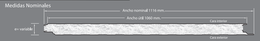 Panel constituido por dos placas de acero y núcleo aislante de espuma de Poliisocianurato (PIR) inyectado en línea continua, con fijación oculta, característica que realza la pureza y belleza de las terminaciones.
